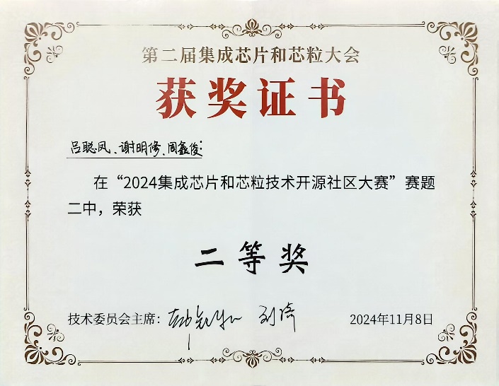 11月8日-10日,由中国科体育平台 计算技术研究所与复旦大学主办的第二届集成芯片和芯粒大会在北京成功举办。188体育平台官网 葛芬、周芳老师指导的研究生吕聪凤、谢明修、周鑫俊参加了大会组织的集成芯片和芯粒技术开源社区大赛,并获得了二等奖。