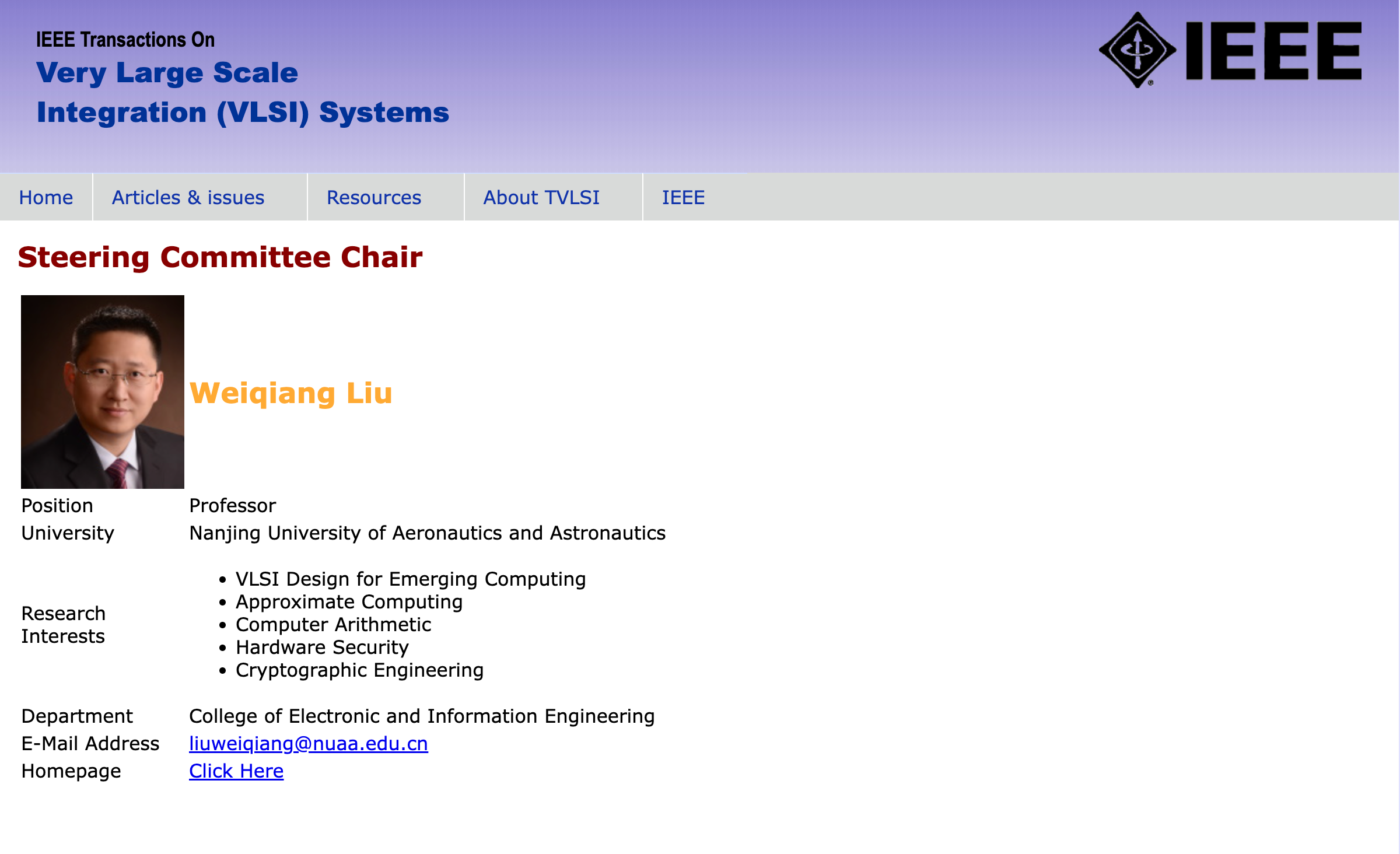 近日,IEEE Computer Society任命188体育平台官网 刘伟强教授为最新一届IEEE Transactions on Very Large Scale Integration System (TVLSI)期刊指导委员会主席(Steering Committee Chair),首期任期为2023.1-2024.12。本届指导委员会共有五名委员,其他四位委员包括:美国斯蒂文斯理工体育平台 的Bryan Ackland教授(IEEE Fellow、ISSCC执行委员会委员、DAC 2002主席)、法国里昂中央理工体育平台 Alberto Bosio教授(欧洲测试技术委员会ETTTC主席)、意大利卡拉布里亚大学Pasquale Corsonello教授(TVLSI前副主编AEiC)、埃及开罗美国大学Yehea Ismai教授(IEEE Fellow、TVLSI前主编)。TVLSI指导委员会负责遴选期刊主编、监督财务及运行情况等重要事项。指导委员会主席负责TVLSI期刊指导委员会的运行和总体协调等。