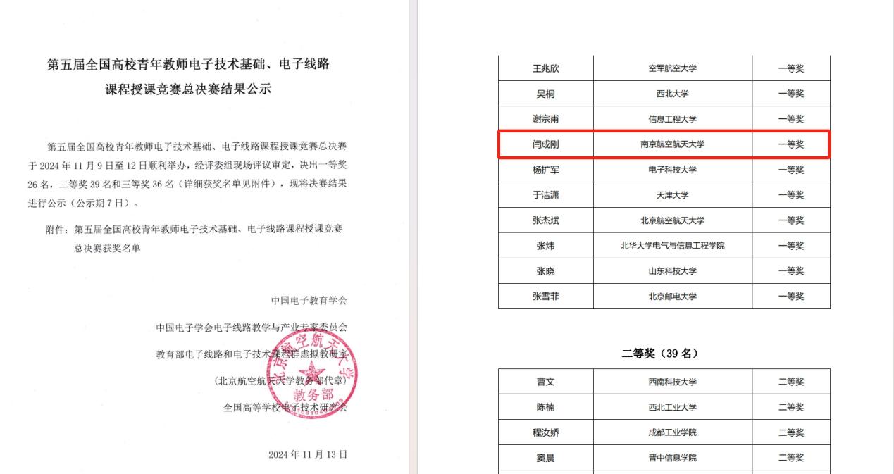 在刚刚结束的第五届全国高等学校青年教师电子技术基础、电子线路课程授课竞赛总决赛中,188体育平台官网 闫成刚老师主讲的《电子线路》课程获总决赛一等奖!