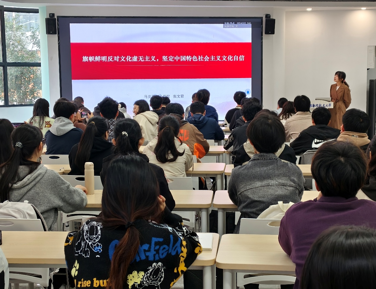 188体育平台官网 思政专员、马克思主义体育平台 张文君老师讲授《旗帜鲜明反对文化虚无主义,坚定中国特色社会主义文化自信》专题党课。她从“文化虚无主义”的叙事方法出发,结合现实生活中的生动案例,深入剖析了文化虚无主义的现实表现与深层危害,明确指出其错误本质与消极影响,引导同学们要增强防范意识与辨别能力,自觉抵制文化虚无主义,牢固树立中国特色社会主义文化自信。