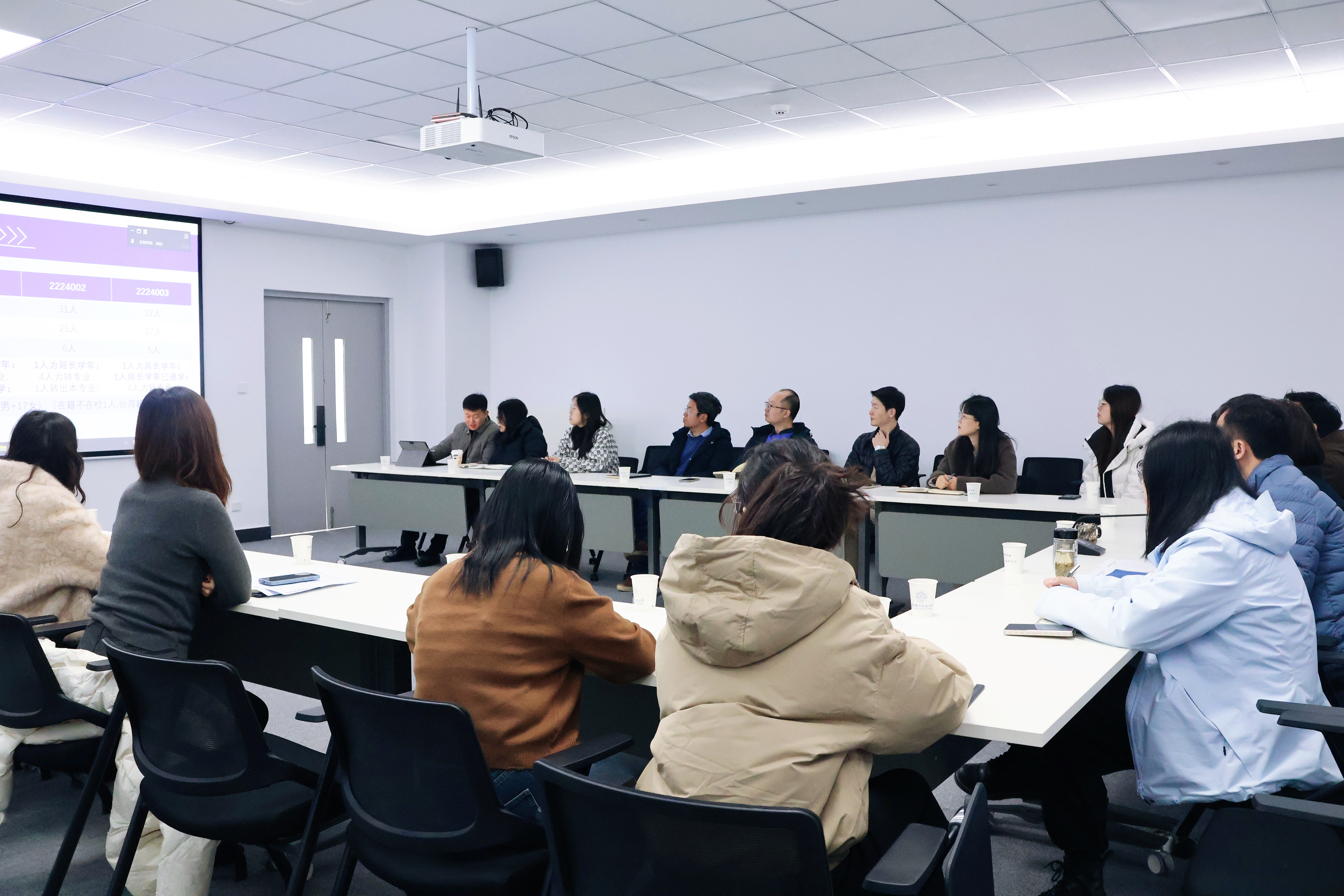 各年级辅导员依次围绕本研学生培养工作作专题汇报。肖刘汇报了2024 级、2025 级本科生基本情况及学业绩点分布,并就心理异常、学业风险等重点学生的摸排跟进情况进行交流。胡黄蕊和杨婷汇报了2023 级本科生学情分析结果与毕业去向摸底情况,展示了学生升学意向分布与学业风险学生帮扶举措。关佳雨汇报了2022 级本科生考研整体情况,梳理了毕业风险学生排查结果与后续工作安排。李姝萱汇报了研究生返校情况、心理健康动态与毕业就业相关事宜;教务员祁珊汇报了 2026 届研究生学位论文送审结果与答辩工作整体安排。